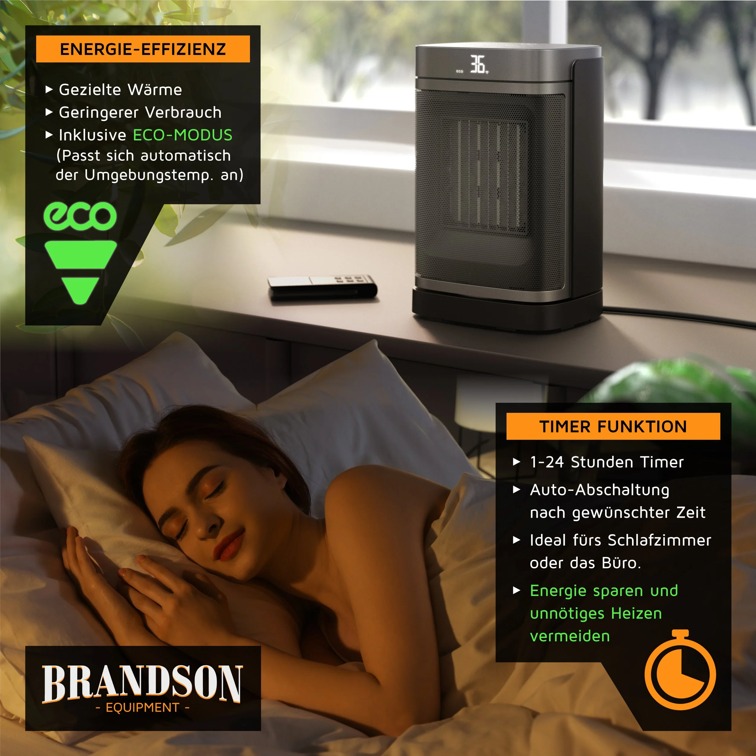Der elegante Brandson Keramik-Heizlüfter vereint eine hohe Heizleistung mit einem ansprechenden Design und hochwertigen Keramikelementen. Heizen Sie schnell, sicher und energieeffizient bei geringem Stromverbrauch. Mit der Timerfunktion können Sie den Brandson Heizlüfter ganz individuell zwischen 0 und 24 Stunden einstellen. Dank der praktischen Oszillationsfunktion verteilt der Keramik-Heizlüfter in wenigen Minuten die Wärme gleichmäßig.