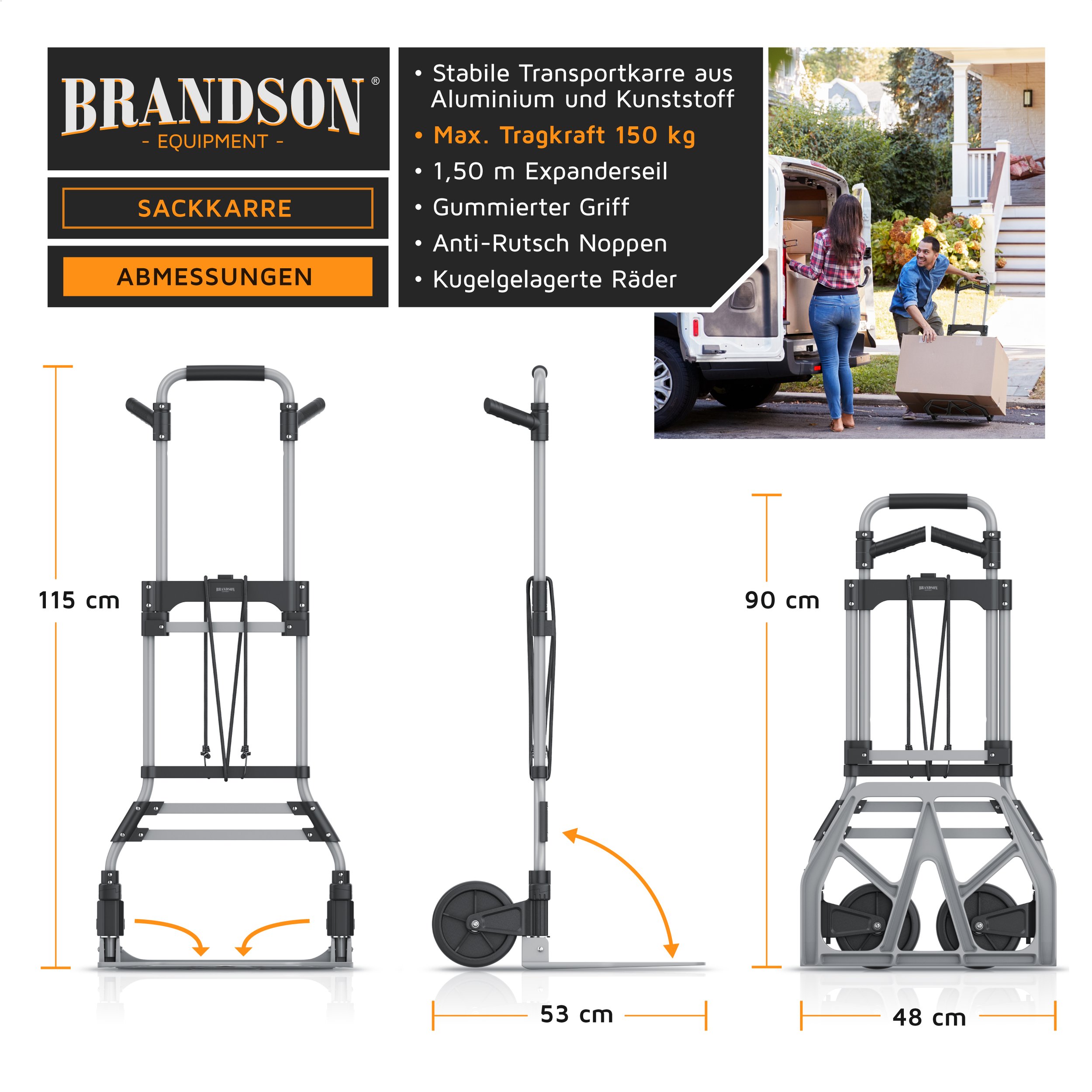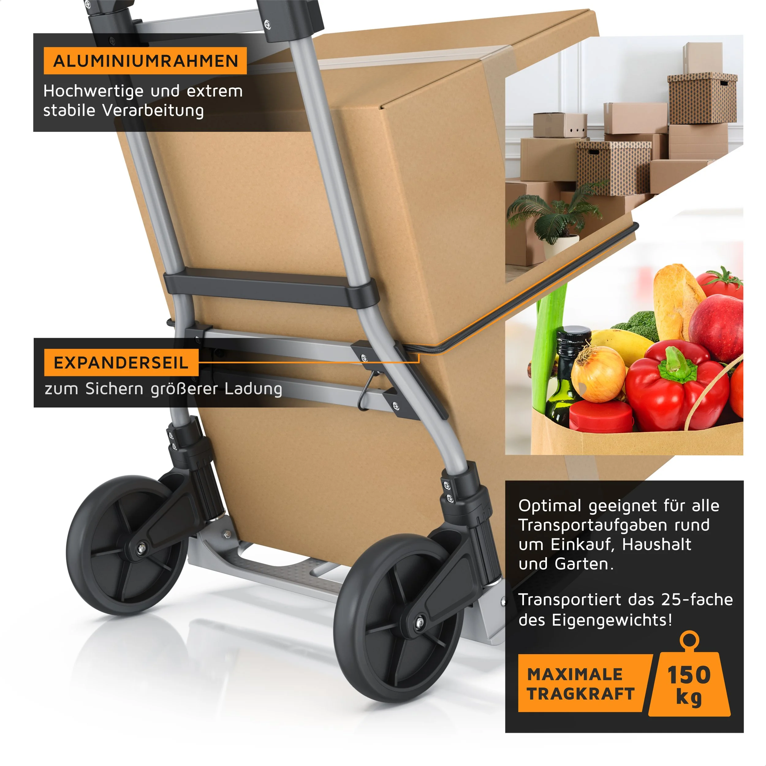 Ob im Haushalt, beim Umzug oder im Lager: Die Brandson Sackkarre überzeugt mit hoher Tragkraft, cleverem Klappmechanismus und sicherem Handling. Dank Alu-Kunststoff-Konstruktion, gummierten Griffen und Expanderseil meisterst du Transporte bis 150 kg mühelos, zuverlässig und stabil.