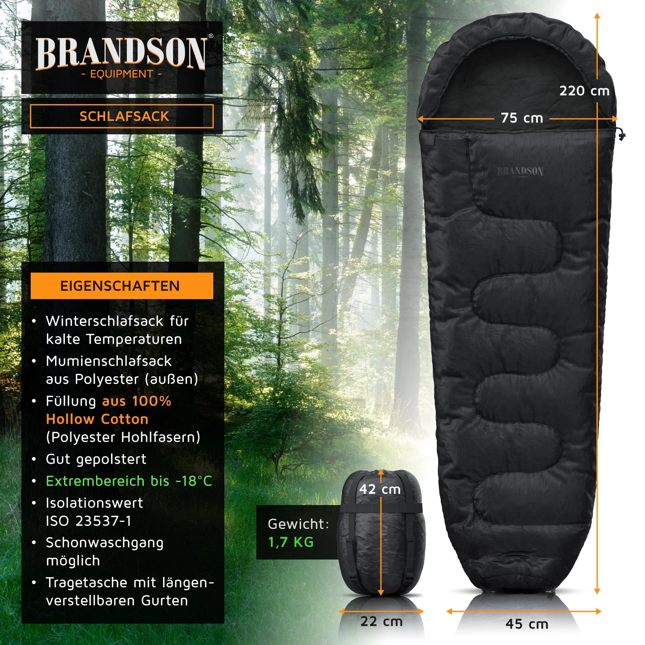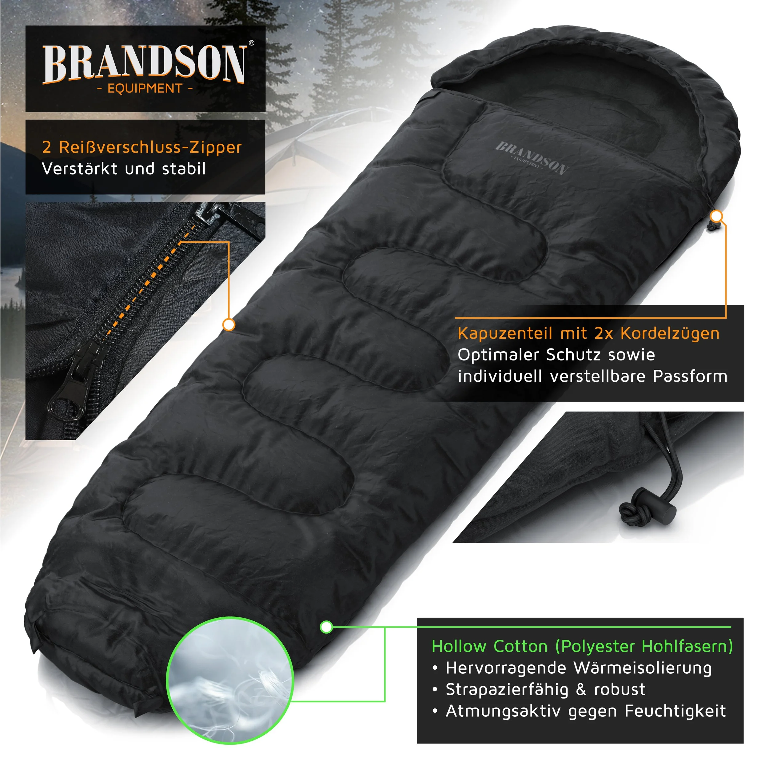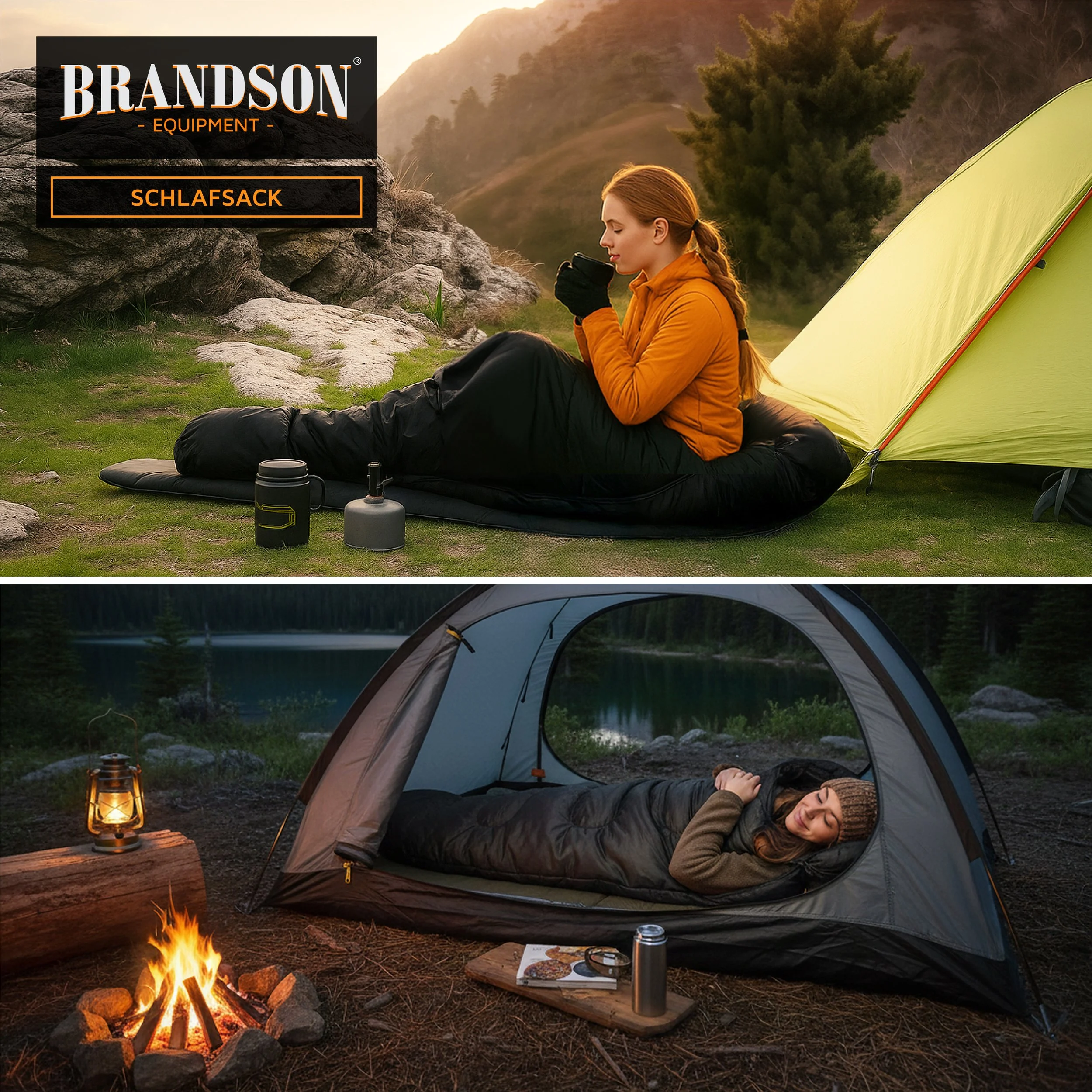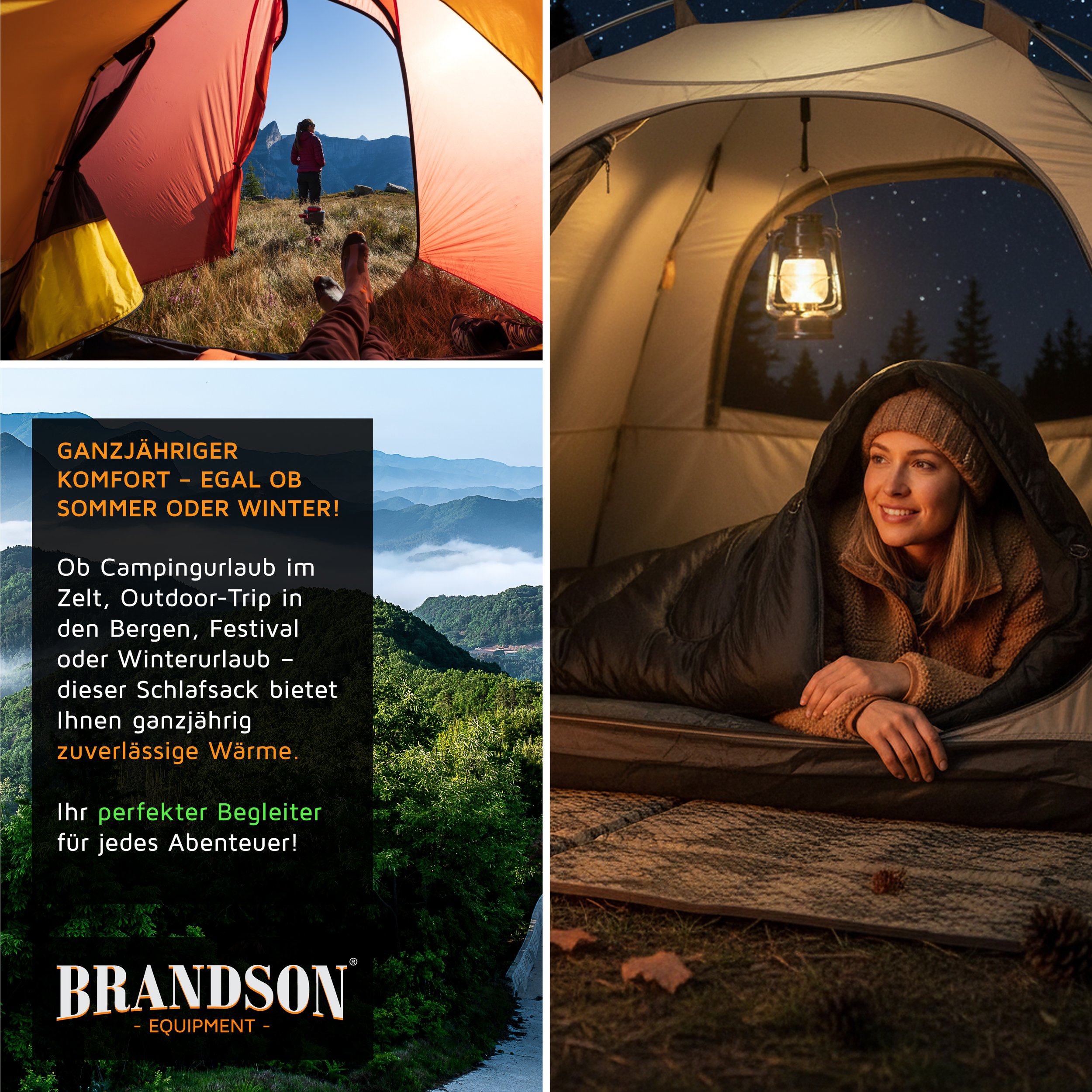 Warm, bequem und ideal für unterwegs. Der große Schlafsack von Brandson bringt Dich der Natur näher! Egal ob auf dem Festival, beim Zelten in den Bergen oder unterm Sternenhimmel im Garten – dieser Mumienschlafsack sorgt mit robuster Polyesterhülle und wärmender Hollow-Cotton-Füllung für trockenen, erholsamen Schlaf. Mit einer Isolationsleistung von 6 clo (Komfort bis +4 °C, Limit –2 °C, Extrem –18 °C) bist du bestens für kalte Nächte gerüstet. 220 cm Länge, 75 cm Breite und eine Innentasche für Wertsachen bieten Sicherheit und Komfort – ideal für alle, die draußen nicht auf Schlafqualität verzichten wollen.